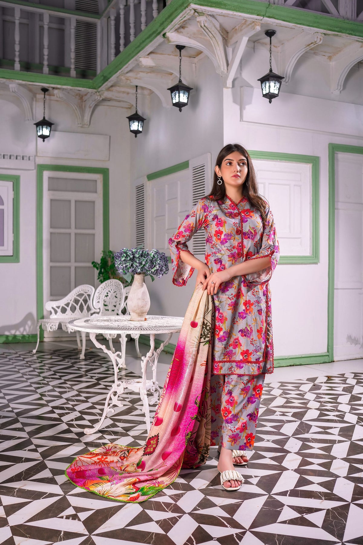 The MH Branded Luxury Korean Fancy Linen Suit, a three-piece ensemble, showcases a captivating blend of colors with intricate all-over prints. To complete the look, it includes a sophisticated fancy linen dupatta.
