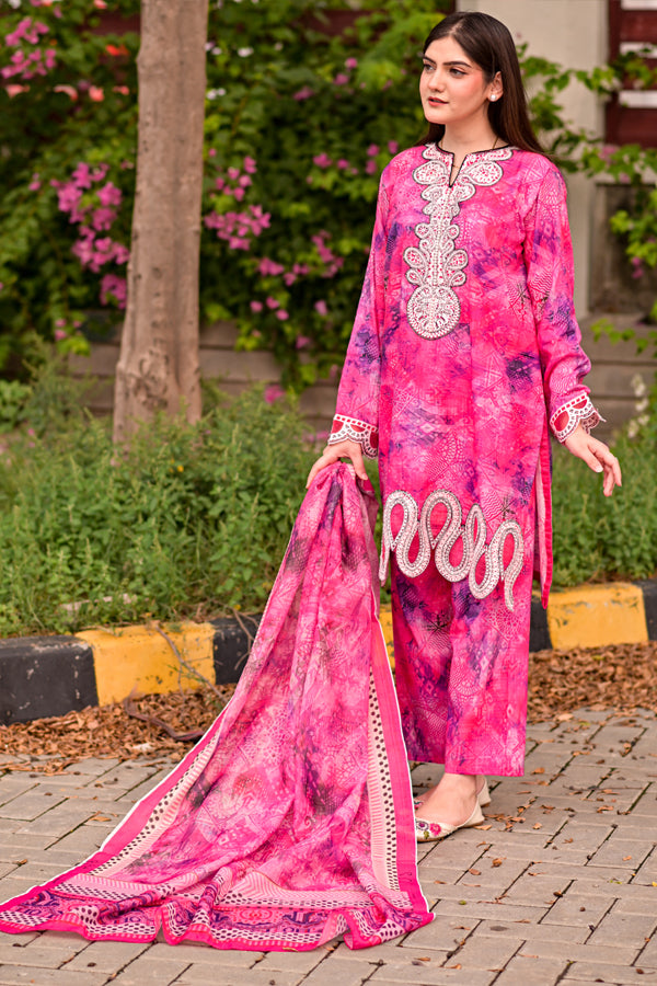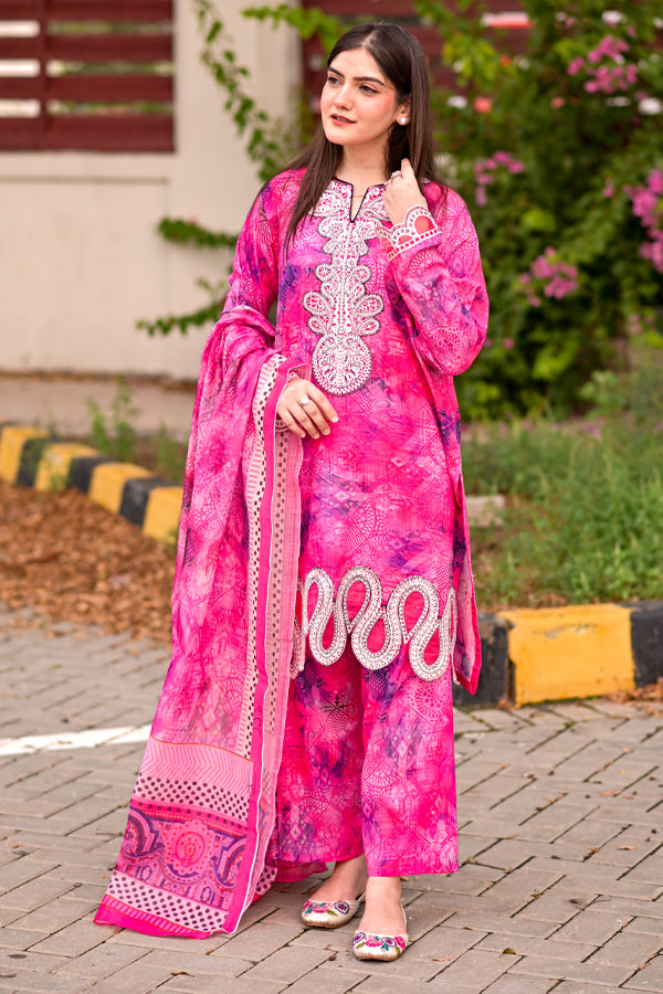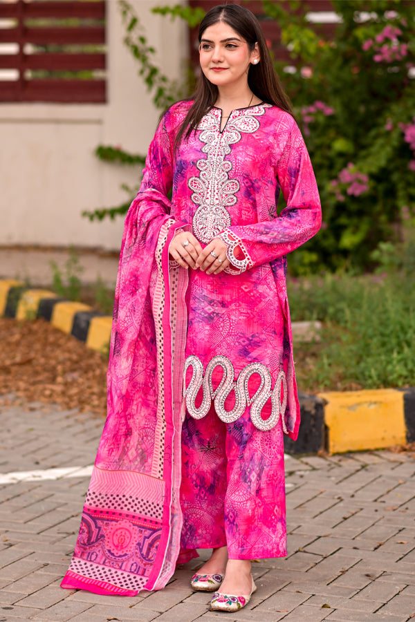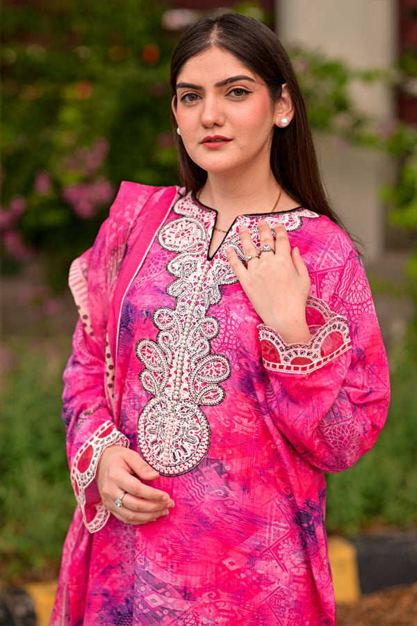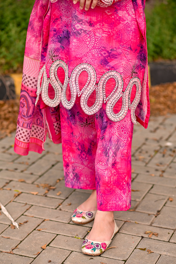 Refresh your summer wardrobe with our Serenity 3-Piece Suit, a beautifully designed ensemble crafted from premium cotton lawn. Rooted in traditional Pakistani elegance, this occasion-ready outfit blends timeless charm with modern sophistication. The soft pastel peach hue brings a breezy vibrance, while the lightweight, breathable fabric ensures all-day comfort.